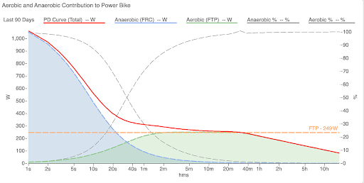 The chart below is taken from Training Peaks Analysis Software WKO5, showing aerobic and anaerobic contribution to power output on a bike over time, plotted against a typical hyperbolic power duration curve.