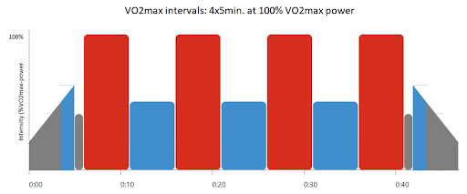 As a suggested workout to train your VO2 Max, look for 15-25 minutes of ‘work’ in Zone 5/just above FTP, i.e. ‘4x 5 minutes at VO2 Max Power (c.105% FTP), with equal work-rest.